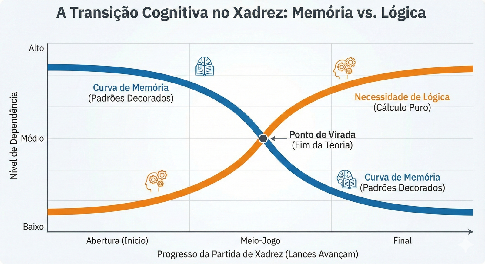 - Meio-Jogo (Lógica Pura): À medida que a partida avança, as combinações se tornam únicas. A IA chega a uma posição que nunca existiu exatamente daquela forma em seu banco de dados.