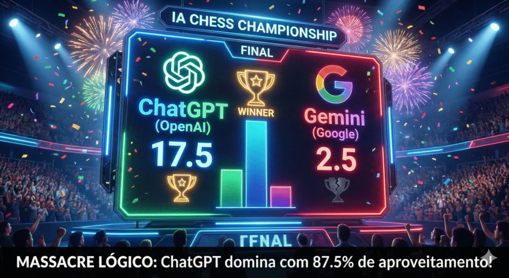 Para resolver isso, saímos da teoria e fomos para o campo de batalha definitivo da estratégia: o Xadrez. Colocamos o ChatGPT (GPT-4o) para enfrentar o Gemini Pro em um match de 20 partidas. Não foi apenas um jogo; foi um teste de estresse de alucinação, consistência e capacidade de planejamento. O resultado? Um verdadeiro massacre que expôs as entranhas de como esses modelos “pensam”.