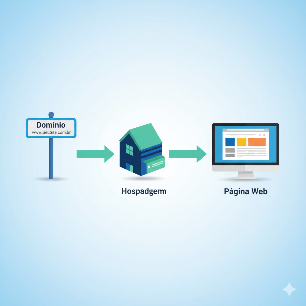 Qual a diferença real entre domínio e hospedagem? Pense no domínio como o endereço do seu site (ex: seusite.com.br). É como as pessoas te encontram. A hospedagem é o “terreno” e a “casa” onde seus arquivos, imagens e páginas ficam armazenados (salvos) para que o mundo possa acessá-los. Você precisa dos dois para ter um site no ar.